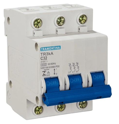 Com o Disjuntor TR3KA 3P 32A Curva C Tramontina você irá garantir alta qualidade para seus projetos elétricos. Desenvolvido para garantir a segurança da instalação, ele preserva a rede elétrica e seus equipamentos em caso de sobrecarga ou curto-circuito. Ele é instalado no quadro de distribuição e dimensionado de acordo com a potência dos equipamentos, números de tomadas e quantidade de lâmpadas. Sua montagem é individual, sem a necessidade de desmontar o barramento, o que otimiza o tempo de instalação. Um item com a qualidade Tramontina, que você já conhece e confia!